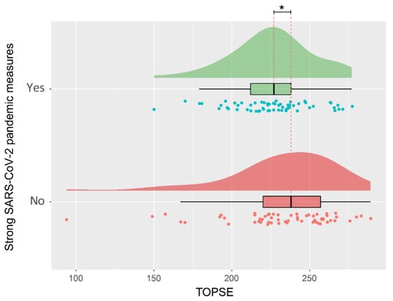 The questionnaires completed during the lockdown period were statistically matched to controls before or after the lockdown period by survey times (1 week after birth, 6 weeks after birth (at term for preterm birth), and 3 months after birth) and by gestational age of the participants’ infants. The data were processed and analyzed using GraphPad Prism version 8.0 (GraphPad Software, San Diego, California USA), SAS, version 9.3 (SAS Institute, Cary, NC, USA), and scistat (MedCalc Software Ltd., Ostend, Belgium) and JASP (JASP Team, v. 0.11.1). Visualization of the results was performed with R (version 4.0.2). The data was tested for normal distribution. All statistical tests were two-sided. p values < 0.05 were considered statistically significant for all analyses. Wilcoxon rank sum test (Mann Whitney U test) was used to analyze the influence of strong pandemic measures on univariate analysis. Additionally, a linear multivariable regression model with the TOPSE Score as outcome variable and strong pandemic measures as principal exposure variable was carried out, including variables with a significance on univariate analysis at ≤0.02 or clinical importance.