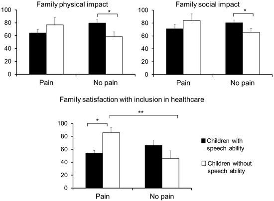 Statistical values of group comparisons in all the different dimensions of the Family Impact and Healthcare Satisfaction modules. Two-way ANOVAs, with PAIN (children with pain vs. children without pain) and SPEECH (children with speech ability vs. children without speech ability) as between-subject factors. * p < 0.05, ** p < 0.01.