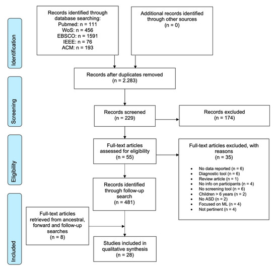 A systematic search was conducted following the Preferred Reporting Items for Systematic Reviews and Meta-Analyses (PRISMA) reporting guideline recommendations [28] to identify studies reporting on commercially available ICT solutions or assistive technology products to screening children aged 0–6 years for ASD. The search was performed using the following academic databases: MEDLINE, consulted through the free electronic access PubMed; PsycINFO, ERIC, and CINAHL consulted through EBSCOHost; and Web of Science. IEEE and ACM digital libraries were also included. Search terms related to children, ASD, information technology and screening were used, and the search queries conducted with each database are listed in Appendix A.