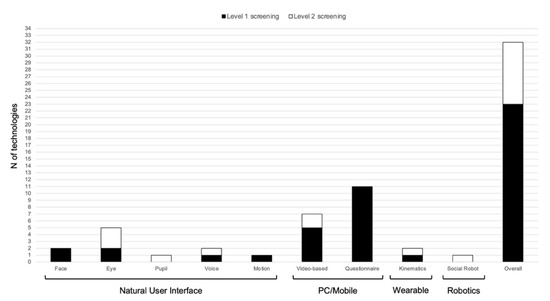 Accordingly, our objectives are to review studies that implemented technological solutions specifically developed to screen for ASD in clinical practice, laboratory settings, at children’s homes, or in community settings, and to determine the level of development (maturity) reached by those solutions, as well as their expected contribution in supporting ASD screening practices. This review focuses on both Level 1 and Level 2 screeners. While Level 1 screening tools may be used to identify children at risk of ASD in the general population, Level 2 screeners are mainly used to distinguish between children with signs of ASD and those with other developmental concerns (e.g., language disorders, intellectual disability, other neurodevelopmental disorders). In this view, screening for ASD may be conceived as a multistep process, according to which children who fail a Level 1 screening would require a secondary (i.e., Level 2) screener before being referred to a more comprehensive and diagnostic assessment process [12,13,27] Providing such a comprehensive overview of the literature (including both levels of ASD screening) was thought to be useful to guide researchers and professionals in their choice of technology options in daily practice, as well as to stimulate their research initiatives aimed at adding essential evidence about technology-based ASD screeners.