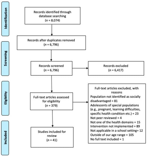 Figure 1 below details the search and screening process. The literature search yielded 8074 publications; after removing 1908 duplicates, 6796 publications were subsequently screened. Of these publications, 6417 were excluded based on title and abstract because they did not fulfil one or more of the inclusion criteria. The remaining 379 publications were retrieved for full-text review. A total of 338 failed to meet the inclusion criteria. The main reasons for excluding full texts were that the intervention targeted a population which was outside of the age range, the intervention was not implemented with populations which were socioeconomically disadvantaged. Finally, 41 publications were included for review.