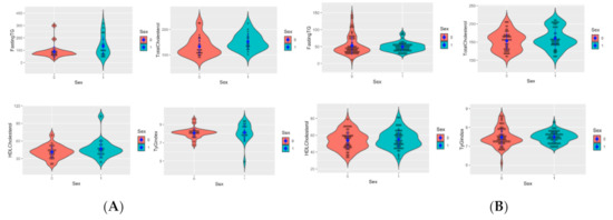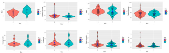 Figure 1 reports the distribution of the variables under examination in the two groups: children with disabilities (panel A) and healthy control children (panel B). The violin plots, including the scatterplot, show the differences between the distribution of the variables in males and females. Overall, the children-with-disabilities group showed a more widely dispersed distribution of the variables related to glucose metabolism and insulin resistance compared to the healthy controls. Specifically, there were differences between the disabled children group and the healthy control children in the biochemical variables of fasting insulin, HOMA-IR, fasting triglycerides, and HDL cholesterol, but there were no major differences between the two sexes within either group.