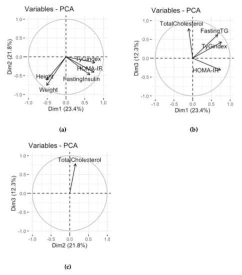 The panel shows the three subspaces defined by the three PCs. When the subspace defined by the two principal components describes the variables well, these are projected toward a circle unity radius, also known as the circle of correlation. As can be seen in (a,b), the trygliceride glucose index (TyG index), homeostasis model assessment for insulin resistance (HOMA-IR), and fasting insulin variables are all well described by the subspace defined by the PC1 and PC2; they all correlate with each other and also positively correlate with PC1. In (c), we can note that the subspace defined by the PC2 and PC3 describes well only the total cholesterol variable.