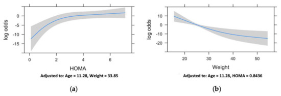 Restricted cubic spline curve showing the model-predicted log odds of being a child with disabilities against homeostasis model assessment for insulin resistance (HOMA-IR) (a) and weight (b) values. Shadowed areas represent 95% confidence intervals. The curve is derived from a multiple logistic model adjusted for all the covariates. On the Y axis, the conditional effect in terms of the log odds of being a child with disabilities is displayed, whereas, on the X axis, the values of the specific variables are shown. As can be seen in panel (a), the HOMA-IR has a major effect in discriminating between the group of children with disabilities and healthy control children at values below 2. In fact, at values greater than 2, the curve almost reaches a plateau. In panel (b), the non-linear conditional effect of the weight variable can be observed with a decrease in log odds of being a child with disabilities as weight increases, with a reduction at higher weights.