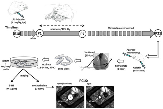 The term mouse is in a saccular stage of lung development at birth [28]. Only postnatally does alveolarization begin with ongoing vessel and capillary angiogenesis; thus, the mouse has been used to model preterm human lung, airway, and vascular development [29,30]. Precision-cut living lung slice (PCLS) preparation allows for measurements of intrapulmonary airway and intrapulmonary vessel responses with intact parenchymal structures [31,32]. The objectives of the present study are: (1) to investigate the longer-term effects of fetal exposure to maternal inflammation (LPS) and postnatal mild hyperoxia during the saccular and early alveolar stages of lung development on intrapulmonary airway and vessel reactivity by PCLS preparations, and (2) to investigate changes in lung gene expression after room air recovery in this mouse model. We hypothesize that prenatal maternal LPS and postnatal hyperoxia exposure increase airway and vessel reactivity and that LPS and hyperoxia are associated with upregulation of inflammatory gene expression.