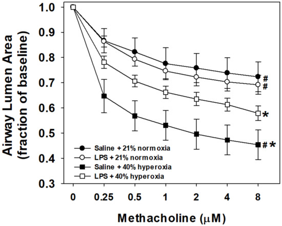 Airway responses to methacholine challenge in the in vitro living lung slice preparation from 21-day-old mice. PCLS airway responses to increasing doses of bath-applied methacholine in mouse pups that received one week of neonatal (P1–7) hyperoxia (squares) or normoxia (circles) and were born from pregnant dams that received an i.p. injection of saline (filled symbols) or LPS (open symbols) at E18 stage of pregnancy. Airways from hyperoxia-exposed mice pretreated with maternal saline were the most reactive (steeper slope, maximum airway contraction). Maternal LPS treatment and postnatal hyperoxia (open squares) significantly increased airway reactivity compared to control (saline + normoxia; filled circles), but attenuated the reactivity of hyperoxia alone (filled squares). Maternal LPS alone (open circles) did not differ in airway reactivity compared to control mice. Values are the means ± 1SEM. Significant differences in the dose response to methacholine: *vs. saline+normoxia (p < 0.05); #vs. LPS+hyperoxia (p < 0.05).
