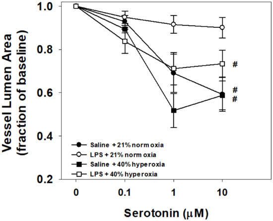 Vessel responses to serotonin challenge in the in vitro living lung slice preparation from 21-day-old mice. PCLS vessel responses to increasing doses of bath-applied serotonin in mouse pups that received one week of neonatal (P1–7) hyperoxia (squares) or normoxia (circles) and were born from pregnant dams that received an i.p. injection of saline (filled symbols) or LPS (open symbols) at E18 stage of pregnancy. Vessel reactivity of control (saline + normoxia; filled circles), hyperoxia alone (filled squares), and LPS with hyperoxia (open squares) did not significantly differ between groups. Prenatal maternal LPS alone (open circles) significantly attenuated vessel reactivity compared to all groups. Values are the means ± 1SEM. Significant differences in the dose response to serotonin: #vs. LPS+normoxia (p < 0.05).