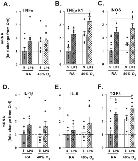 Changes in lung mRNA expression from 21-day-old mice. qRT-PCR of inflammatory-related molecules and receptors (A–F) from 21-day-old mice that received one week of neonatal (P1–7) hyperoxia (40% O2, white bars) or normoxia (RA, gray bars) and were born from pregnant dams that received an i.p. injection of saline (S, no cross-hatches) or LPS (cross-hatches) at E18 stage of pregnancy. Prenatal maternal LPS treatment with room air increased inducible nitric oxide synthase (iNOS; C) and transforming growth factor (TGFβ; F) mRNA expression in the lung. Hyperoxia mice pretreated with maternal LPS had increased tumor necrosis factor receptor (TNFαR1; B), iNOS (C) and TGFβ (F) mRNA expression compared to control mice. Data are expressed as fold change from saline + normoxia control mice (S+RA). Filled dots indicate individual animals and open dots exceed the 4-fold change of axis (TNFαR1: RA+LPS 5.0-fold change, 40% O2+LPS 4.2 and 4.2; TGFβ: 40% O2+LPS 4.7, respectively). Bar graph values are the means + 1SEM; brackets indicate p < 0.05 vs. control.