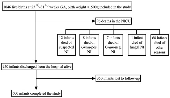 The following are available online at https://www.mdpi.com/2227-9067/8/3/207/s1, Table S1. Baseline characteristics of infants, who completed the study vs. infants, who were lost to follow up or died. p-values were calculated towards those infants, who completed the study. Table S2. Baseline characteristics of uninfected infants versus infants with NIs. Table S3 Baseline characteristics of uninfected infants versus infants with suspected, Gram-positive, Gram-negative, fungal NI and NEC. Table S4: Regression Model for Nosocomial Infection Subtypes excluding NEC.