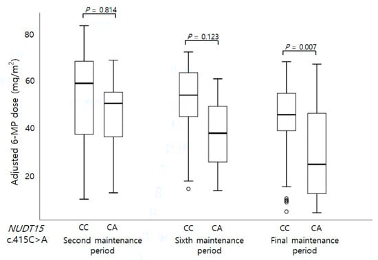 6-MP dose at sixth maintenance period (mg/m2)CC48.3 ± 16.71.000AA47.9 ± 17.10.615CC51.0 ± 15.60.123