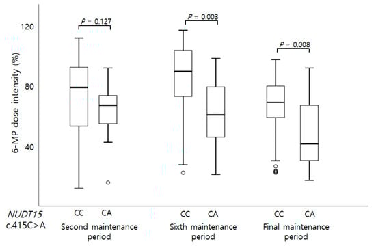 6-MP dose intensity at second maintenance period (%)CC68.1 ± 25.60.235AA67.0 ± 24.80.877CC72.7 ± 24.30.127