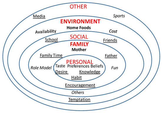 The Socio-Ecological Model (SEM) provides a framework for understanding the multiple levels that influence health behaviors [18] such as child obesity risk [19,20,21] or dietary behavior [22,23]. Ecological Models, such as SEM, view child obesity as a system, with multiple levels of influence [20,24,25]. The individual (intrapersonal level) is nested within and interacts with social (interpersonal) and community (environmental) domains. Understanding how these domains interact to influence food-related behaviors, and ultimately, consumption, is essential to understanding behavior and developing effective intervention approaches.