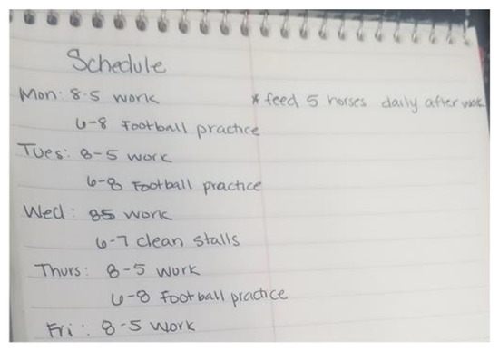 Time. Similar to culture, time was seen as having negative, positive, and variable effects by many mothers. Limited time or demanding schedules were most often mentioned. For example, one mother provided a photograph of the family’s weekly schedule. (Figure 4) Between her work schedule and the child’s extra-curricular activities, it was difficult to eat a healthy meal at home: I did a copy of our schedule, our weekly schedule at home. Because a lot of times…well I’m not going to say a lot of times, but sometimes it’s hard to prepare a healthy meal or even eat a healthy meal because our schedule is so tedious. And you know it’s a lot of time consuming, a lot of driving. And so with my son playing sports, he has practice three days a week. So sometimes we don’t have the time to actually sit down and have a healthy meal. You know we’ve got to get it on the go (P.9A).