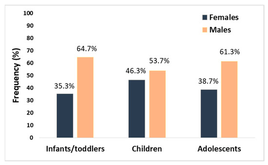 In our study, which was based on 89 children with AIS (aged from the 28th day of life to 18 years), the male sex also predominated in the total group (58% of cases were males) as well as in the subgroups according to age [4]. Figure 1 shows the sex prevalence in age subgroups of children with AIS analysed by us earlier (i.e., infants/toddler (aged between the 28th day of life and the 35th month of life), children (aged 3 to 11 years), and adolescents (aged between the 12th year of life and the 18th year of life)). The particular numerical advantage in the incidence of stroke in males was visible in the groups of infants and toddlers and adolescents; in the group of infants, this advantage was almost twofold [4].