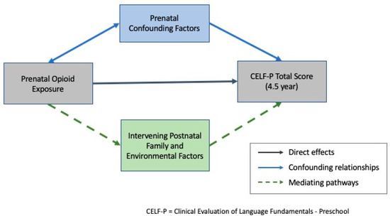 Another important issue concerns the mechanisms that may place opioid-exposed children at an increased risk of language difficulties, and even more importantly, the identification of both (a) prenatal factors that may help explain later child risks, and (b) modifiable postnatal factors which might buffer them from later risk. On average, research shows that pregnant women who use/abuse opioids are more likely to come from lower socioeconomic backgrounds [24,25], to have fewer educational qualifications, and to be subject to higher rates of other mental and physical health problems [24,25,34,35,36]. Greater physical and mental stress among these women can translate to poorer prenatal care, which coupled with prenatal opioid exposure and associated poorer prenatal nutrition, may negatively impact fetal development [37,38]. These factors may also have an indirect effect on child language development through family functioning and parenting [24,25,39,40].