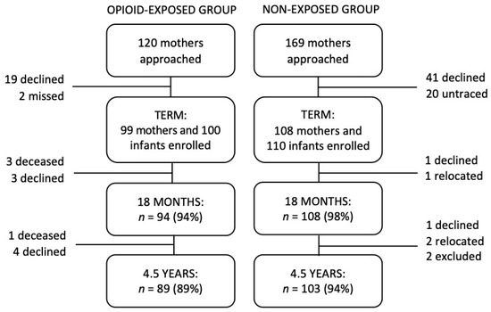 The participants were drawn from a prospective longitudinal study of two groups of children born between 2003 and 2008 at Christchurch Women’s Hospital, New Zealand [11,13,34]. The first study group consisted of 100 infants (58 male) born to women with OUD who were maintained on methadone during pregnancy. The second reference or control group of children recruited were not exposed to opioids, and were randomly selected from the hospital booking schedule during the same period. The reference or non-exposed (NE) group consisted of 110 infants (48 male) who were born into families whose socioeconomic profiles were representative of the regional population at the time of birth [11,14]. Mothers from both groups were recruited during the third trimester or at birth. Exclusion criteria included inability or refusal to consent, HIV diagnosis, delivery outside the region, very preterm birth (gestation of 32 weeks or less), suspected fetal alcohol syndrome, congenital anomalies, and non-English speaking. Retention to age 4.5 years was 89% for the OE group and 94% for the NE group. Figure 2 provides the overall study participation and retention from birth to 4.5 years. Further details about recruitment and study women pregnancy course and personal histories are available in previous publications [11,34]. Key family social background information and infant neonatal characteristics are summarized in Table 1.