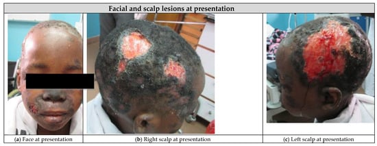 A 10-year-old HIV positive girl was admitted to the inpatient malnutrition ward in Mbeya, Tanzania in 2016 following a 2 month history of fevers, progressive ulcerated scalp lesions, indurated and violaceous facial plaques, and subcutaneous nodules on her neck, arms, and trunk (Figure 1a–c). The patient started antiretroviral therapy (ART) two years prior to presentation but reported poor adherence to her first line ART regimen of zidovudine, lamivudine, and efavirenz. At presentation, the patient had severe acute malnutrition, severe immunosuppression, and severe cytopenias (Table 1).