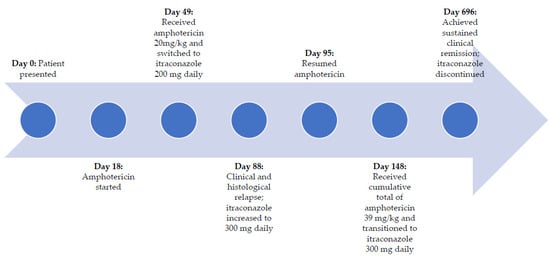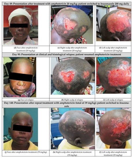 On day 18 after presentation, she received her first dose of intravenous (IV) amphotericin B deoxycholate as an inpatient, then was discharged to continue her daily amphotericin infusions, together with wound care, directly observed therapy (DOT), nutritional support, and other supportive care as an outpatient at the Baylor College of Medicine Children’s Foundation—Centre of Excellence (COE) in Mbeya, Tanzania.