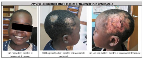She received a total of 20 mg/kg of IV amphotericin B deoxycholate (23 doses) over a 4 week period without complications (Figure 1d–f). On day 49, she was then transitioned to oral itraconazole (200 mg/day) based on her clinical improvement and a repeat biopsy which demonstrated clearance of organisms. She continued her DOT at the clinic and took her itraconazole with a carbonated cola beverage to increase the absorption of the drug. Three weeks into her course of oral itraconazole (day 88), she experienced clinical relapse, and repeat histopathology showed recurrence of histoplasmosis. Her dose of itraconazole was increased to 300 mg/day, however, a week later, her relapse continued to worsen (Figure 1g–i), thus she was switched back to amphotericin B infusions on day 95 and received an additional 19 mg/kg of amphotericin over an 8 week period (to reach a lifetime cumulative dose of 39 mg/kg). During this course of amphotericin, she experienced rigors which were treated with meperidine and transient nephrotoxicity (peak creatinine of 97 µmol/L and urea of 9.1 mmol/L), which resolved after completion of the amphotericin. Her scalp wounds showed improvement after the additional 8 weeks of amphotericin infusions (day 148, Figure 1j–l), thus she was again transitioned to oral itraconazole (300 mg/day) and showed sustained clinical improvement after 4 additional months (day 271, Figure 1m–o).