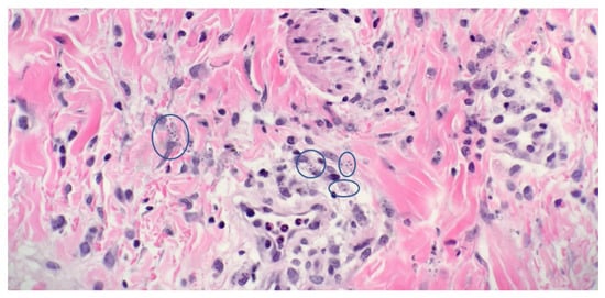Histopathology showing within the superficial and the mid dermis; there is an interstitial infiltrate of lymphocytes, histiocytes, and neutrophils, with few eosinophils. Within the histiocytes, there are numerous organisms, consistent with histoplasmosis (Original magnification ×400).