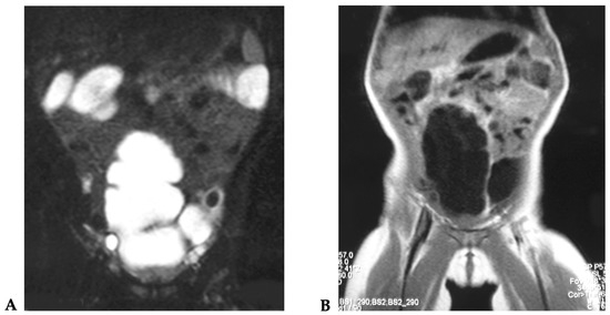 At 12 years of age, during follow-up, the patient did not present long-term complications. Urinary continence was good, with a neo-bladder emptying nearly every 2–3 h (Figure 8A,B). The patient is clean during the day and she presents a good quality of life.