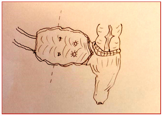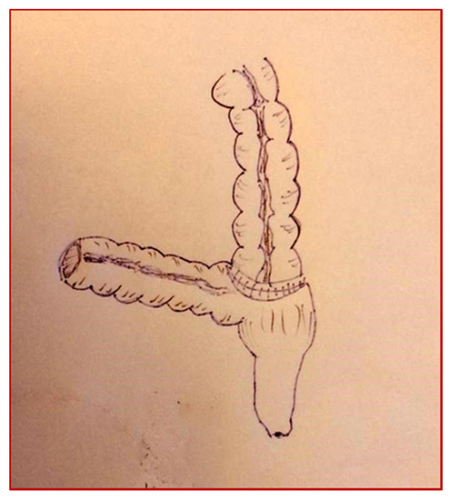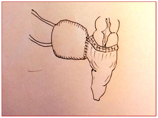 A two-year-old girl came to our unit with abdominal pain and hematuria. A cystoscopy was performed, with evidence of a mass originating from the vesical trigone. We collected biopsies of the mass. The hystological diagnosis was a rabdomiosarcoma of the bladder. The patient started a neoadjuvant therapy and then, according to protocol, she underwent surgery. A cystectomy with the creation of a continent neo-bladder by the Mainz pouch II technique was performed (Figure 1A,B).