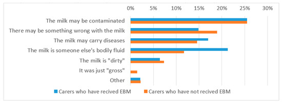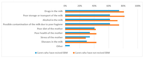 The most frequent concern reported by foster carers was the possibility of harmful substances in the milk (79%). Concerns regarding alcohol in the milk, poor storage and transport of the milk, and possible contamination of the EBM due to poor hygiene were highly prevalent. Additional concerns regarding the health (30%) and wellness (42%) of the mother were also reported by responders (Figure 1).