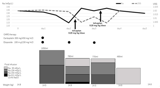 Management of sodium balance for SIADH during chemotherapy with massive infusion is difficult. Willemsen et al. reported the use of tolvaptan for hyponatremia associated with massive infusion during methotrexate therapy for intracranial B-cell lymphoma [6]. Tolvaptan treatment is useful in the management of serum sodium levels through a gradual increase in sodium levels, allowing for liberalizing fluid intake and hyperhydration [6]. In this study, we used tolvaptan prophylactically in combination with massive infusion and were able to keep the serum sodium level almost constant.