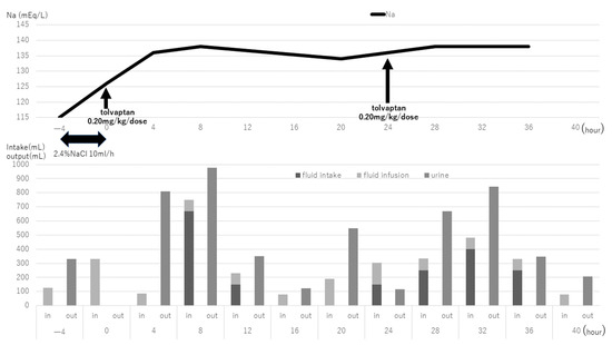 The course of the first cycle of CARE chemotherapy is shown in Figure 1. A total volume of 1050 mL of fluids was administered on day 1, and her serum sodium levels decreased to 115 mEq/L during CARE therapy on the morning of day 2, and she complained of neck pain and nausea. She was treated for symptomatic hyponatremia with 10 mL of 2.4% NaCl per hour for 4 h by intravenous infusion, and her symptoms improved. Considering the possibility of worsening hyponatremia due to fluid infusion during CARE therapy, we decided to continue CARE therapy using tolvaptan (0.20 mg/kg/dose) after obtaining the mother’s consent. The in-out balance and the serum sodium level every 4 h after tolvaptan use are shown in Figure 2. After 4 h of tolvaptan administration, urine volume increased remarkably (maximum 15 mL/kg/h). After 10 h of tolvaptan administration, the serum sodium level was normal (138 mEq/L). After 12 h, the urine volume decreased prior to tolvaptan treatment. On the third day, tolvaptan (0.20 mg/kg/dose) was again administered to prevent hyponatremia, and the serum sodium level remained normal during treatment (Figure 1). Subsequently, hyponatremia was also observed during the second and third courses of CARE therapy, and tolvaptan was used to appropriately manage the serum sodium levels.