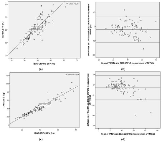 Statistical analyses were performed with the SPSS software package (SPSS Inc., Chicago, IL, version 24.0). Data were analyzed for normal distribution allowing the application of parametric tests. The results are expressed as means ± SD unless otherwise indicated. Assumptions were checked before conducting parametric tests. Data on body composition methods were analyzed with paired t-tests and a p-value of < 0.05 was considered as statistically significant. Further, data obtained with TANITA and BIACORPUS were compared by the Pearson correlation coefficient, and the Bland–Altman plot was used to assess the extent of agreement between the two methods []. The 95% limits of agreement were calculated as the mean difference ± 1.96 SD [].
