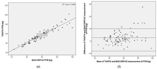 For further evaluation of differences in body composition determined with TANITA or BIACORPUS, Pearson correlation coefficients were used, and Bland–Altman plots generated. As shown in Figure 1, the Pearson correlation was highly significant between the TANITA and BIACORPUS-based determination of BFP (Pearson r = 0.817; p < 0.01, n = 123), of FM (Pearson r = 0.953; p < 0.01, n = 123), and of FFM (Pearson r = 0.941; p < 0.01, n = 123). This contrasts with the result obtained with the Bland–Altman plot, which displays the mean difference between the methods ± 1.96 SD. This analysis indicated important, potentially clinically relevant differences between both methods for BFP, FM and FFM. Thus, the average difference and the 95% limits of agreement was amounted to −2.27% (average) and from −11.17% to 6.62% (range) for BFP, to −2.93 kg (average) and from −14.81 kg to 8.95 kg (range) for FM, and to 2.69 kg (average) and from −8.17 kg to 13.56 kg (range) for FFM. The discrepancy between the methods increased at higher values of BFP, resulting in little agreement in the upper range of the data. Similar discrepancies were determined for FM, which differed by ± 12 kg at a mean of around 40 kg and displayed considerable skewness in the upper data range, and for FFM with a ± 11 kg range at a mean of around 57 kg.