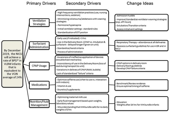 Key driver diagram for reducing Chronic Lung Disease linking change ideas to primary and secondary drivers. Abbreviations: NICU—Neonatal Intensive Care Unit; BPD*—need for supplemental oxygen at 36 weeks corrected gestational age; VON—Vermont Oxford Network; CPAP—continuous positive airway pressure, ETT—endotracheal tube; hrs—hours.