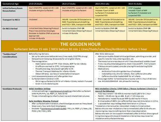 The “Golden Hour” gestational-age based protocol to standardize DR and admission practices. Abbreviations: PPV—positive pressure ventilation; HR—heart rate; NRP—Neonatal Resuscitation Program; DR—delivery room; OR—operating room; TPN—total parenteral nutrition; ABG—arterial blood gas; SIMV—synchronized intermittent mandatory ventilation; PC/PS—pressure control pressure support; PEEP—positive end expiratory pressure; PCO2/PaCO2—partial pressure of carbon dioxide; SpO2—oxygen saturation; ABD—apnea, bradycardia, and desaturation; wks—weeks; hrs—hours.