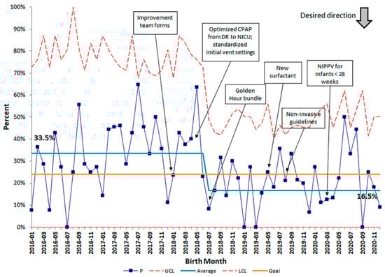 The primary outcome measure was the VON CLD rate, defined as needing supplemental oxygen and/or mechanical ventilation at 36 weeks CGA among inborn infants ≤ 29 6/7 weeks gestation or birth weight < 1500 g, excluding DR or deaths occurring within the first 12 h of life. Infants were also classified as CLD if discharged/transferred before 36 weeks CGA on oxygen. Secondary outcome measures included failed extubation rate and need for postnatal steroids, repeat surfactant, or discharge diuretics. Process measures (Table A2) included compliance with DR surfactant guidelines and initial ventilator settings. Our balancing measures (Table A3) were failed extubation rate and use of postnatal steroids as described above. All data were gathered from a local database and/or extracted from the electronic medical record. Statistical Process control charts (QI Macros, KnowWare International, Inc., Denver, CO, USA) were used to display and analyze data over time. Special cause variation was determined using suggested criteria specific to health care [8]. Pre- and post- “Golden Hour” CLD rates were compared by chi-squared analysis.