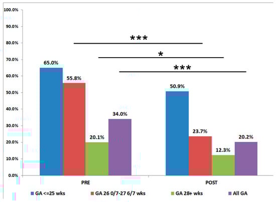 Comparison of Chronic Lung Disease (CLD) rates before (PRE) and after (POST) the QI initiative. The overall (purple) rate of CLD decreased from 34.0 to 20.2%. Gestational Age Specific CLD rates decreased among infants 28–29 weeks (green) and 26–27 weeks (red), and <25 weeks (blue). * p < 0.05, *** p < 0.001. Abbreviations: SPC—statistical process control; SMART—Specific, measurable, achievable, relevant, time-bound.