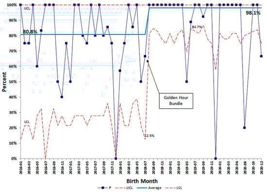 SPC p-chart for delivery room surfactant administration. Special cause variation was observed after initiation of the golden hour bundle, raising the control line from 80.8% to 98.1%. Subsequent months where variation occurred outside of the lower control limit prompted chart review and reeducation of providers and staff. Abbreviations: SPC—statistical process control; P—proportion; UCL—upper control limit (upper dotted red line); LCL—lower con-trol limit (lower dotted red line).