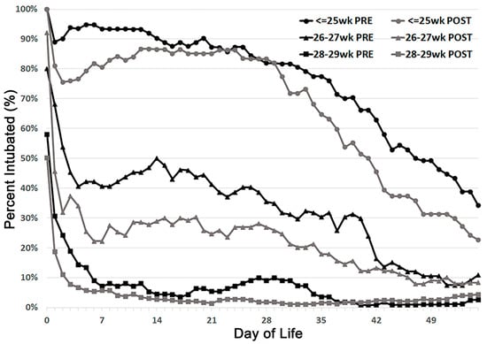 Intubation rates among all GA groups improved after starting the “Golden Hour” initiative (Figure 6, gray lines). Some infants ≤ 25 weeks GA were extubated by DOL 3, but these extubations were rarely successful, as the intubation rate climbed back above 85% during the second postnatal week when many infants experience an increase in ventilator and oxygen requirements, termed “pulmonary deterioration” [9]. However, a sustained decrease in intubation rates occurred starting at approximately DOL 28 through DOL 56. With focus on standardizing extubation readiness and mode (non-synchronized non-invasive PPV), intubation rates for 26–27 weeks infants reduced by approximately 50%. Finally, modest improvements in intubation rates were observed in 28–29 weeks infants though baseline intubation rates were low in these babies.