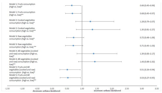 Figure 1 presents the results of five logistic regression models assessing the association of the consumption of fruits (model 1), cooked vegetables (model 2), raw vegetables (model 3), all vegetables (cooked and raw—model 4), and fruits and all vegetables (model 5) with adolescents’ current asthma status. Adolescents who were high consumers of fruits were 32% less likely to have current asthma after adjusting for adolescents’ sex, BMI, parental atopic history, parental smoking, pet ownership, having an older sibling, cooking with fuels, and indoor exposure to dampness or mold (adjusted OR (aOR): 0.68, 95% CI: 0.45–0.97). A non-significant association was observed for cooked, raw vegetables or all vegetables consumption respectively (all p > 0.05). Lastly, when the combined consumption of all three food groups was examined (fruits and cooked and raw vegetables), adolescents who were consuming fruits and all types of vegetables most or all of the days in the past 12 months were 47% less likely to have current asthma compared to the ones who were consuming fruits and all types of vegetables never or up to twice per week in the past 12 months (aOR: 0.53, 95% CI: 0.27–0.95).