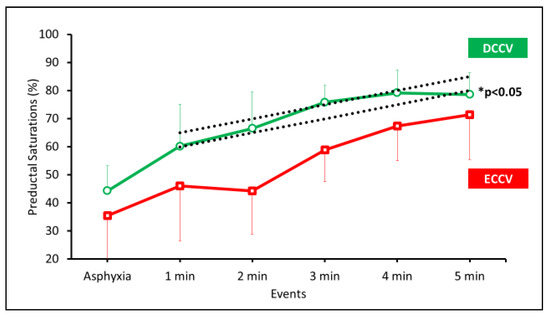Preductal SpO2 are shown on the y-axis and the events or duration of positive pressure ventilation (PPV) on the x-axis. The data are represented as average and standard deviation. The SpO2 between ECCV (early cord clamping followed by ventilation) and DCCV (delayed cord clamping with ventilation) was significantly different (* p < 0.05 by ANOVA).