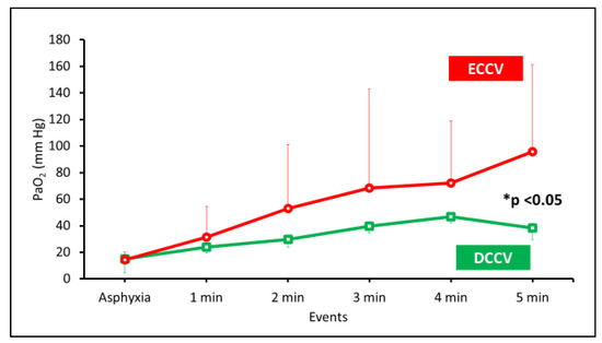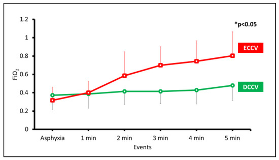 Fraction of inspired oxygen (FiO2) is shown on the y-axis and the events or duration of PPV on the x-axis. The data are represented as average and standard deviation. The difference between ECCV and DCCV was significantly different (* p < 0.05 by ANOVA).