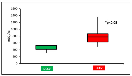 The oxygen load (OL) in milliliters of oxygen per kilogram is shown on the y-axis. The box and whiskers plot shows a significantly higher OL with ECCV compared to DCCV. OL in ECCV was significantly higher compared to DCCV (* p < 0.05 by Kruskal-Wallis test).