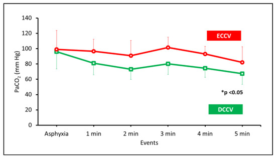 The arterial carbon dioxide (PaCO2 in mmHg) is shown on the y-axis and the events on the x-axis. The PaCO2 was significantly lower in DCCV compared to ECCV. (* p < 0.05 by ANOVA).