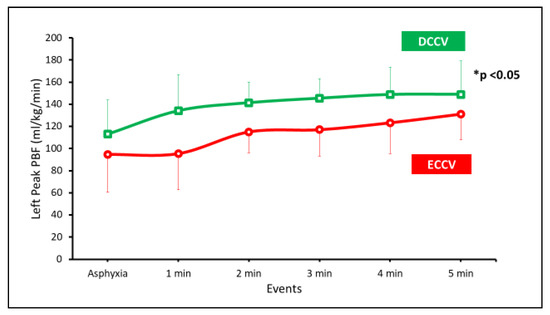 The left peak PBF is shown on the y-axis and the events on the x-axis. The PBF was significantly higher with DCCV compared to ECCV (* p < 0.05 by ANOVA).