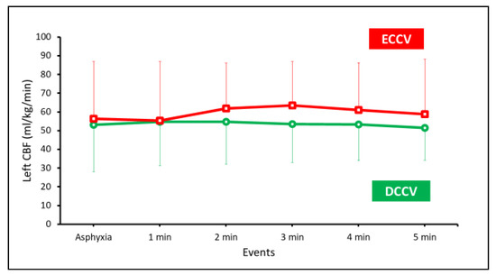 Pulmonary blood flow—the peak left pulmonary blood flows (PBF) were significantly higher in the DCCV group compared to ECCV (Figure 6).