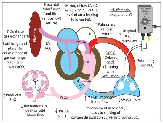 The benefits of delayed cord clamping and ventilation (DCCV) for 5 min in a lamb model of preterm asphyxia. With positive pressure ventilation and an intact cord, there was a mixing of lower umbilical vein oxygen tension (UVPO2) with higher pulmonary venous oxygen tension (PVO2) leading to overall systemic lower oxygen tension (PaO2)—“differential oxygenation” with alveolar hyperoxia but systemic normoxia. With the placenta and lungs simultaneously acting as organs of gas exchange, the arterial carbon dioxide (PaCO2) was lower (“dual-site gas exchange”). Copyright Satyan Lakshminrusimha.