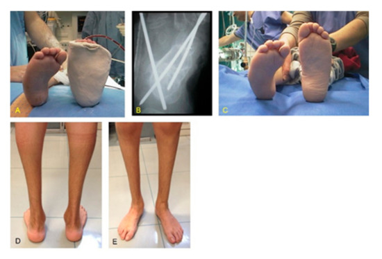 - Templeton, P.A.; Flowers, M.J.; Latz, K.H.; Stephens, D.; Cole, W.G.; Wright, J.G. Factors predicting the outcome of primary clubfoot surgery. Can. J. Surg. 2006, 49, 123–127. [Google Scholar]