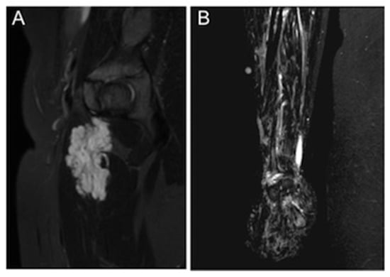 An example of the two different morphological appearances of VMs in MRI. (A) A discrete and well-demarcated VM in the thigh muscles. (B) A diffuse VM of the right forearm.