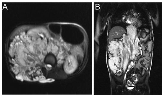 Axial (A) and coronal (B) T2-weighted MR images of an extensive VM affecting the retroperitoneum and spinal muscles and dislocating the bowel and the right kidney to the left.
