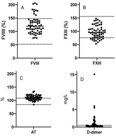 Coagulation factors VIII (A) and XIII (B), antithrombin (C), and D-dimer (D) in patients with venous malformatons. Dotted lines depict reference ranges for each variable.