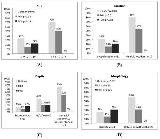 Associations between coagulation variables and clinical and imaging findings. The columns indicate the percentage of patients whose coagulation variables were outside the reference limits (elevated FVIII > 148 IU/dL, decreased FXIII < 76 IU/dL, and elevated D-dimer ≥ 0.5 mg/L). (A) Lesion size; comparison of the largest size group (>25 cm) with the smaller size group. (B) Lesion location; single location lesions are limited to one location (head/neck, extremities, or trunk), multiple locations extend to more than one location or indicate multiple lesions in different locations. (C) Lesion depth; a comparison between 1. subcutaneous, 2. muscle-, joint-, and/or bone-affecting, and 3. intrathoracic, intra-abdominal, or retroperitoneal lesions. The p-values are non-applicable in C due to too small groups for the Chi-square test. (D) MRI-based morphology; comparison between discrete, well-demarcated lesions and diffuse or multifocal lesions.